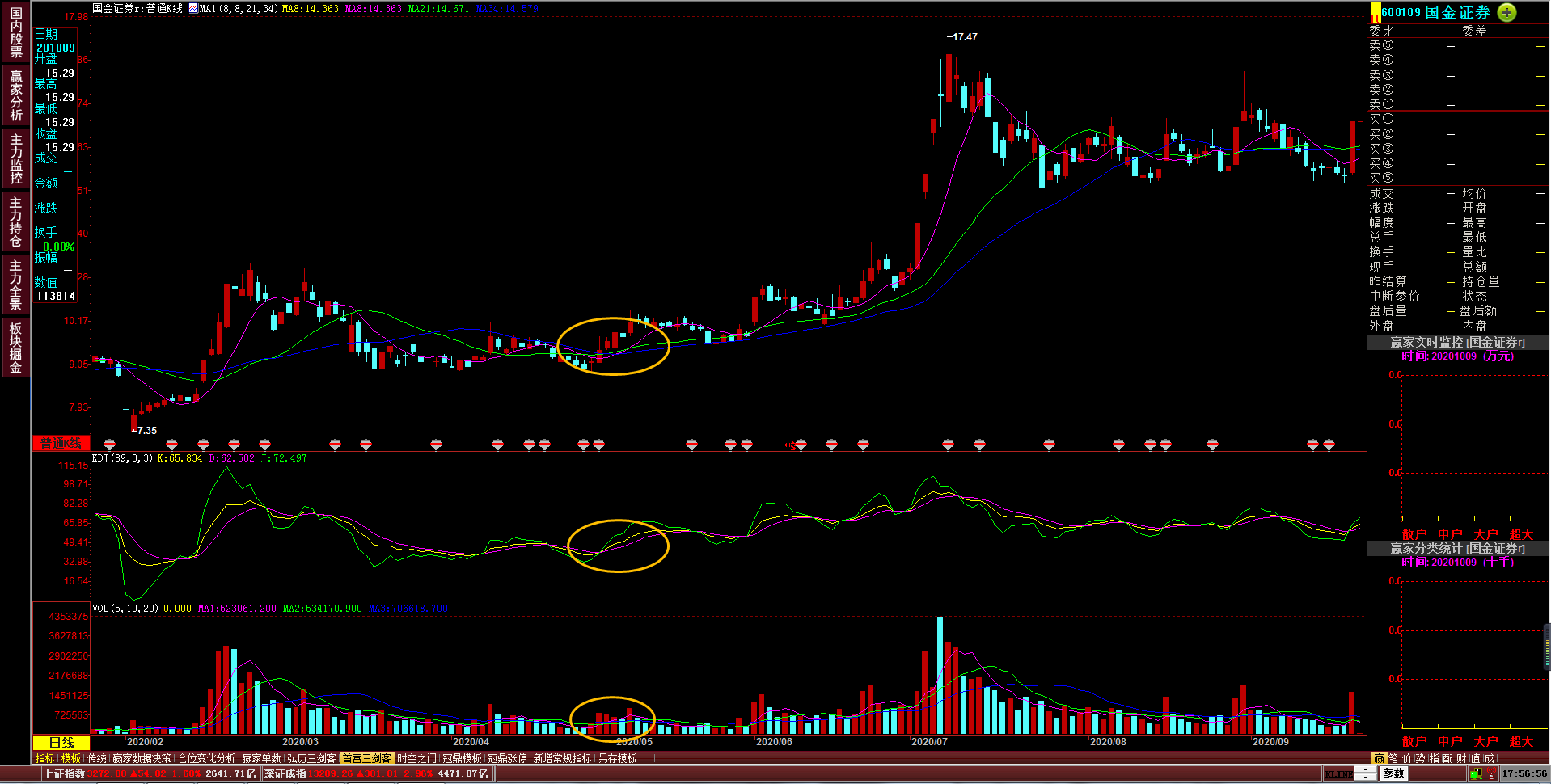 一、拉升股价一般必须具备特定条件(1)建仓完毕 (2)大盘相对处于牛市初期或中期 (3)上市公司具备较重大题材 (4)有足够的资金控盘,具备中长线运作思路 上篇文章已经将机构投资者的资金划分为两大用途。用资金比重的70%左右作为建仓部分,剩余30%左右做为盘中引导股价波动之用。完成建仓过程后,下一步就是要选择适当的时机,拉抬股价,促使股价脱离成本区域,这就进入到第二步换手。现在讲机构投资者的盘中控盘方法与各位读者一起探讨。 二、不同阶段的盘中表现解析(一)开盘解密(开盘前及开盘时的看盘要点) 开盘十分重要。某只股在开盘后突然出现急速的放量上攻态势,往半个小时内的成交量很大。 对于任何一个股票来说,抛盘每天都会有,而且上涨后抛盘会更大。所以股价上涨的话,成交量自然是会放大的,股价上涨取决于多方的意愿。股价上涨,成交量放大,这个成交量放大是取决于卖单而不取决于买单。试想一下,股价开盘就涨停成交量大吗?为什么成交量不大,这是因为卖盘很小。也就是说想买没有人卖就不会放大成交量。 1.瞬间大幅高开:开盘时以涨停或很大升幅高开,瞬间又回落。 其目的: (1)突破了关键价位,机构不想由于红盘而引起他人跟风,故意做成阴线。达到洗盘的效果。 (2)也是一种吸筹的方式。利用高开低走引发部分恐慌性抛盘。从而达到低吸的目的。 (3)试盘动作,试上方抛盘是否沉重。如果抛盘较大,那么放弃拉升的计划。 2.瞬间大幅低开:开盘时以跌停或很大跌幅低开。而后再逐渐拉升股价。 其目的: (1)出货。利用低开高走的方式逐步派发筹码。这种现象目前不太多见了。 (2)有意做图形,吸引场外资金入场,推高股价。 3.开盘应该观察几个方面。 (1)集合竞价: 通过9: 25 分集合竞价,可以分析出机构的今天操作行为。如果今天的集合竞价大于昨天,表明机构今天参与程度高。我们应该密切关注盘中的量价关系及变化。 如果今天的集合竞价小于昨天的集合竞价。表明今天机构做完的可能性较大。普通投资者就不应该盲目操作。 (2)开盘5分钟内的秘籍 开盘价,往往最能体现机构的当日做盘意图。强势股票,开盘就会高开,量也伴随放大。这种股票往往能带来短线的投资收益。 4.判断强势股必备条件: (1)该股所属板块是近期热点; (2)5分钟K线图的表现为: A. 昨日收盘前8, 21, 34分时均线处于粘合状态。K线上穿(突破)均线组; B. KDJ指标(参数定为:K89:;D3; J3))呈现多头向上(金叉); C.成交量放大。 如果符合上述条件。机构做多的概率较大,可以追涨。例如600109 (国金证券),见图(1-1)。 图1-1 2020年4月29日国金证券5分钟图三线粘合(8,21,34周期均线)因此盘中均有买入机会。见图(2-2) 图2-2 小结:运用此方法的关键在于: A.该股5分钟图是否有三线粘合 B.KDJ指标是否多头(金叉)排列 C.成交量是否放大 D.该股是否属于当前的热门板块 E.考虑市场状况(大盘走势) 股票入门基础知识